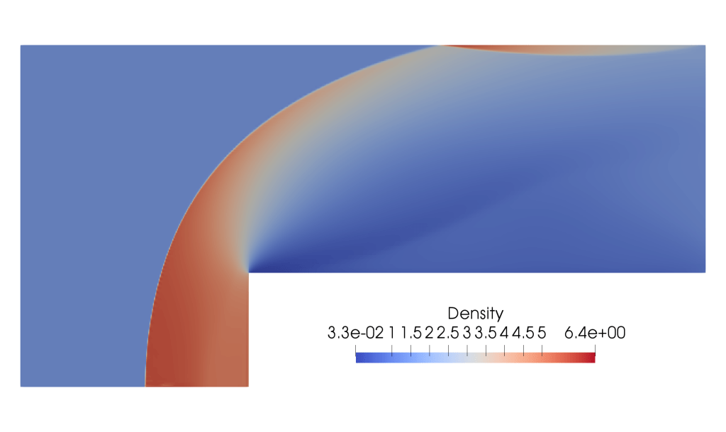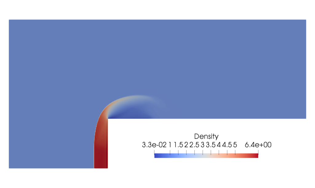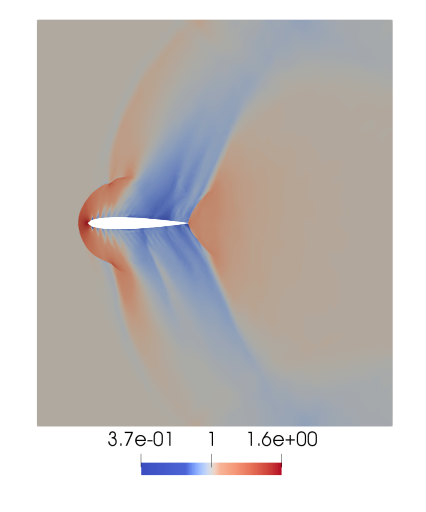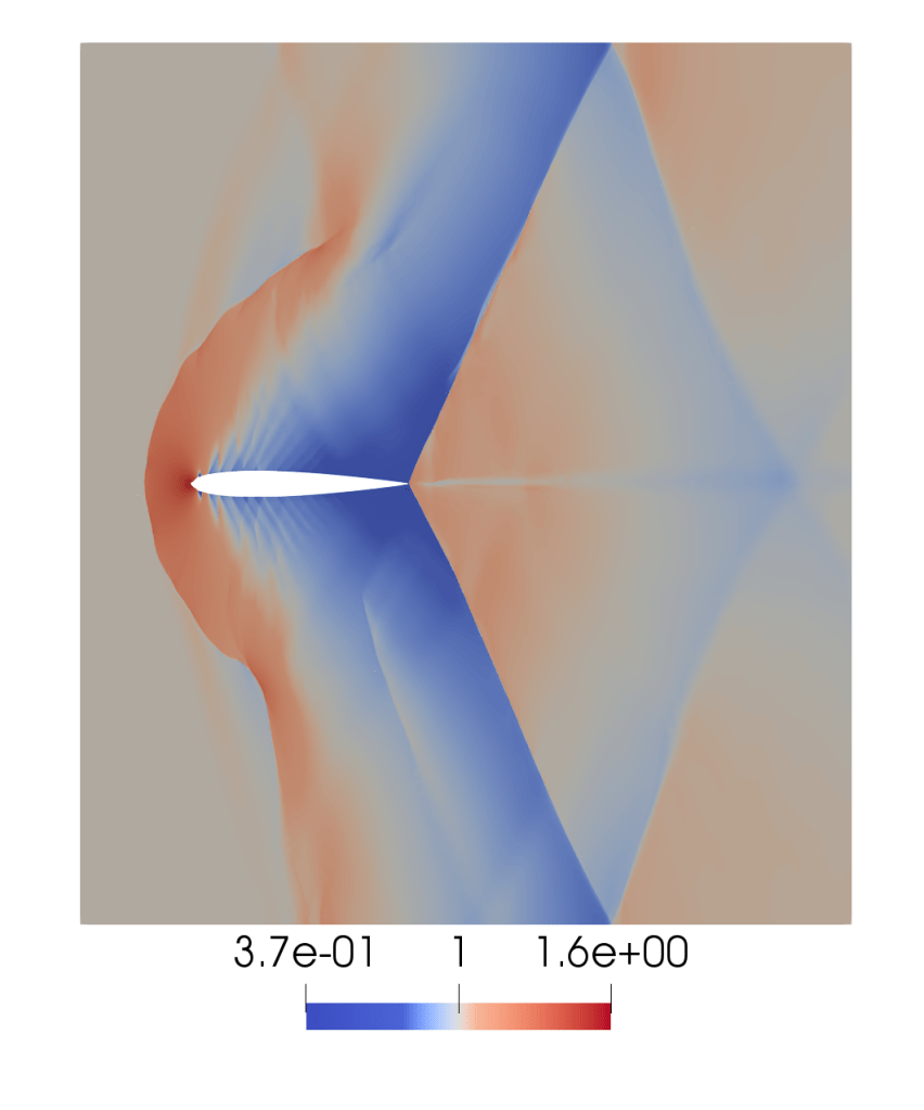 We used data from the Langely Research Centre website to construct a NACA 0012 aerofoil and simulated flow over this at Mach 1.02. Notice the bow shock before the aerofoil and trailing shocks in the wake.